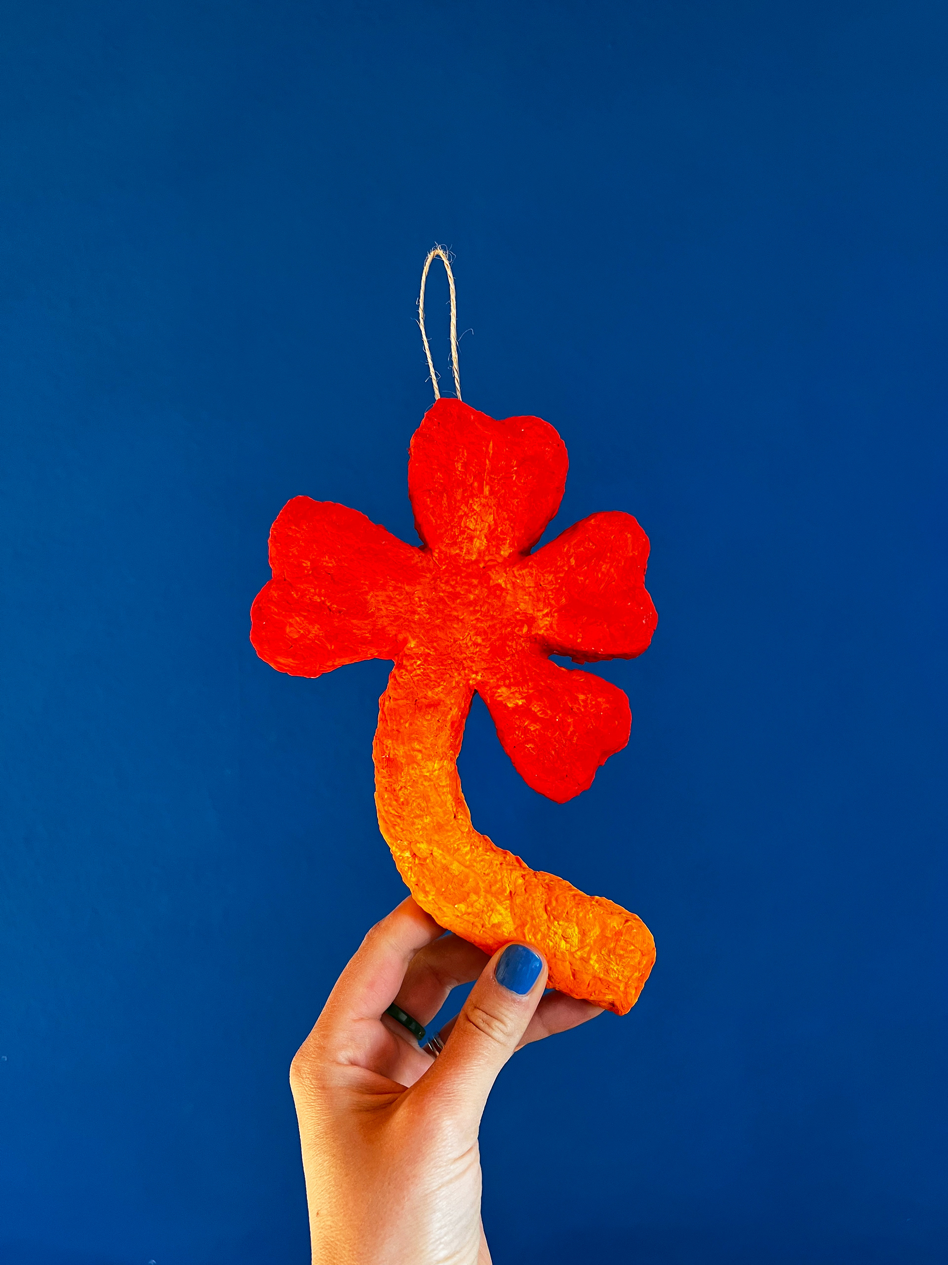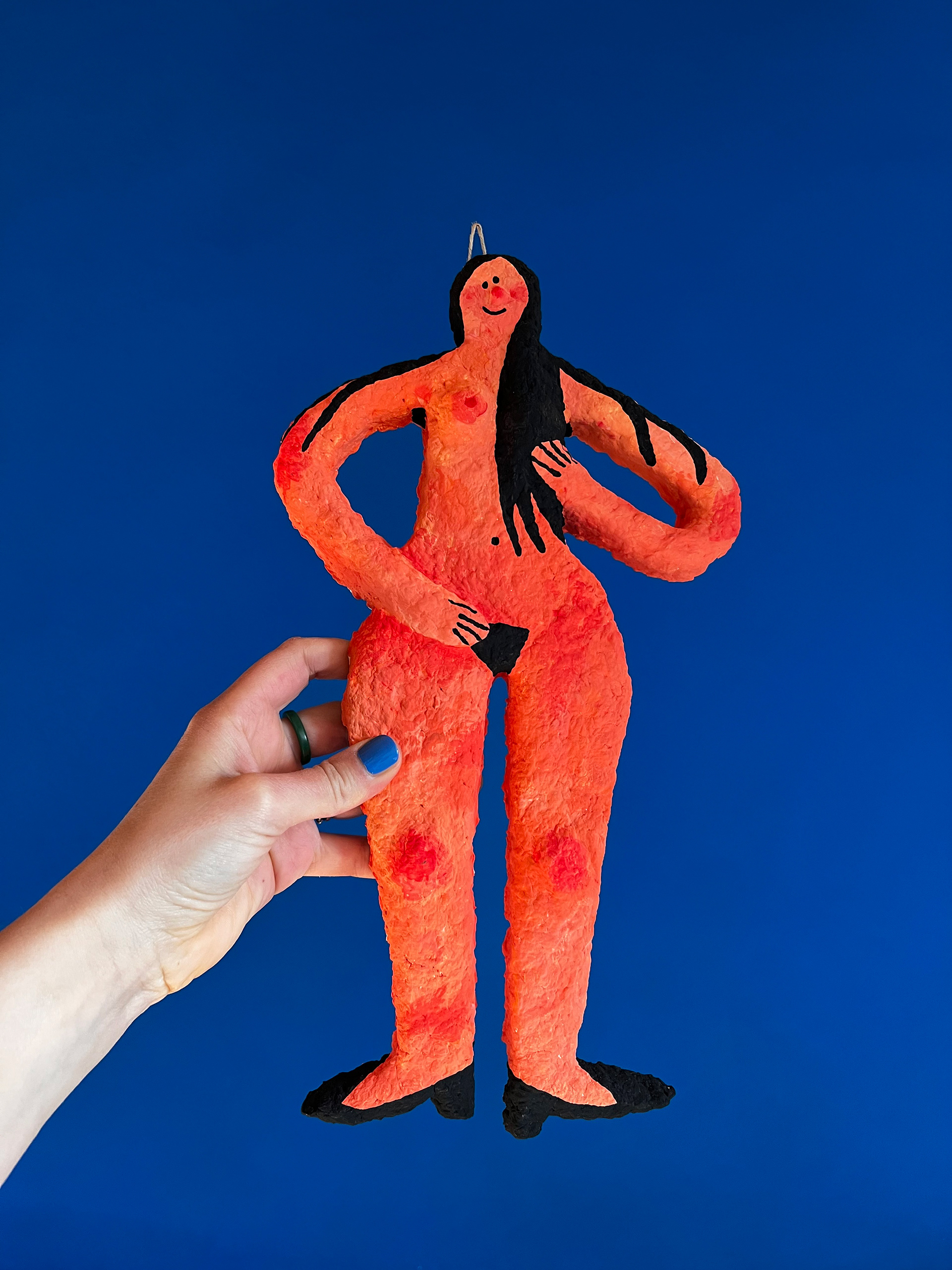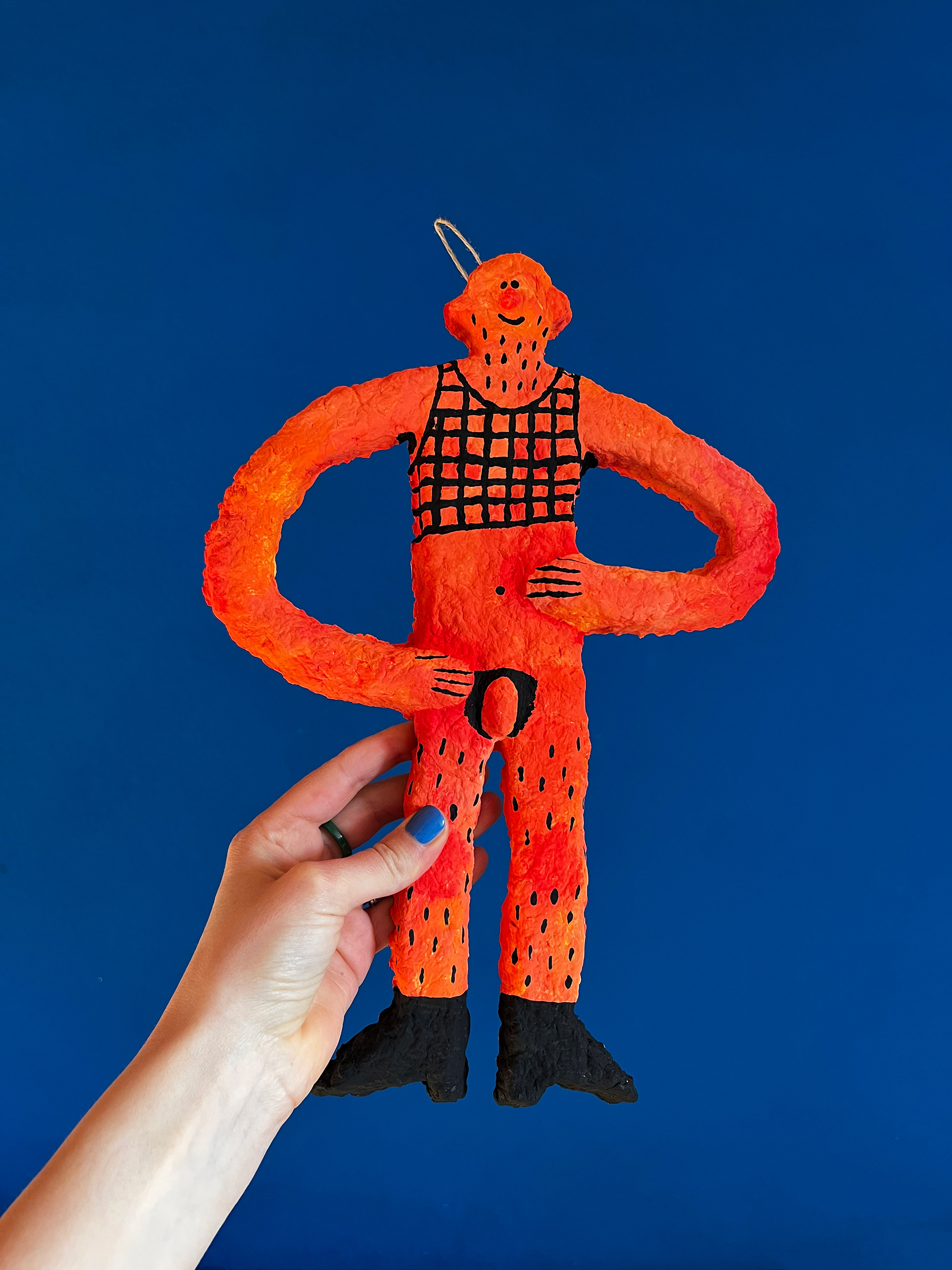 Papier-mâché sculpture of a colorful character, handcrafted in Mannheim. A unique piece of naive art for home decor featuring vibrant colors and whimsical details.