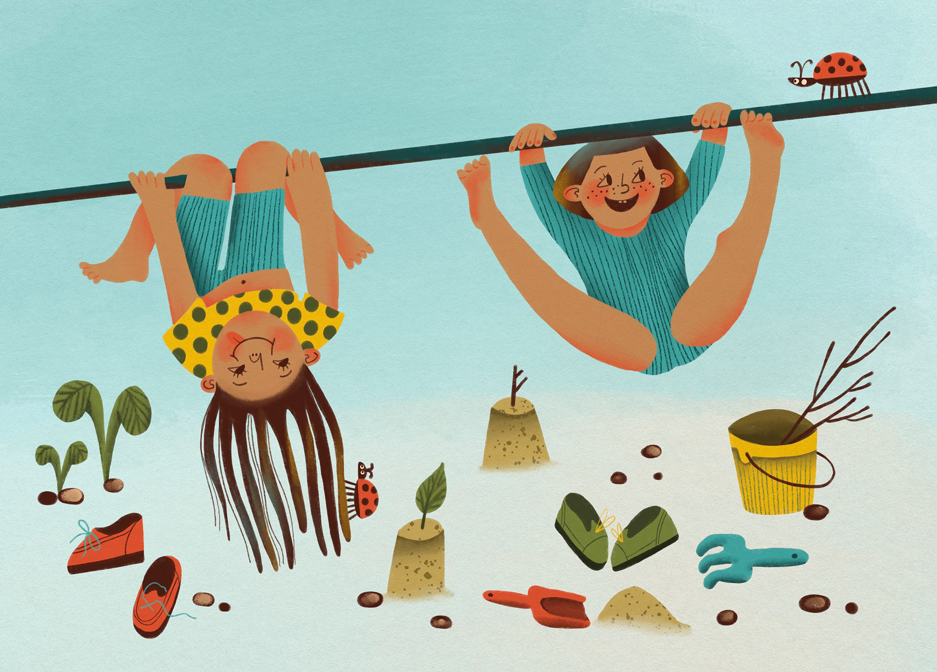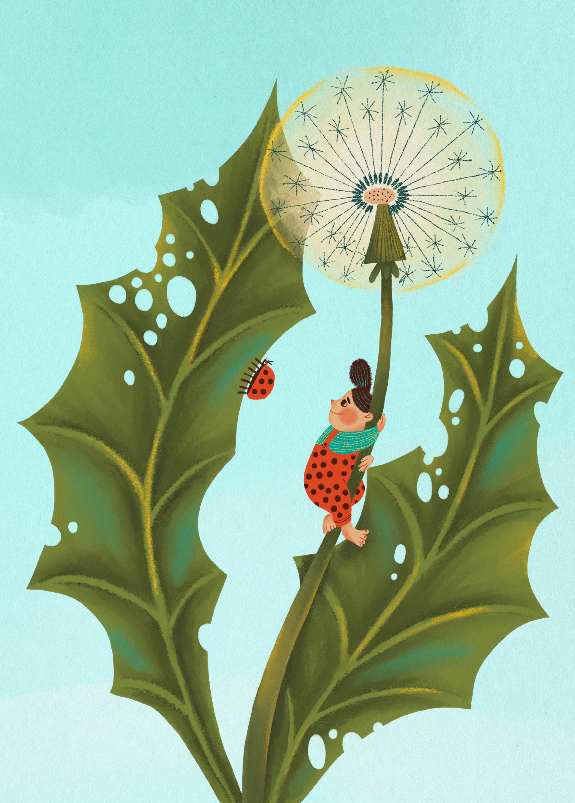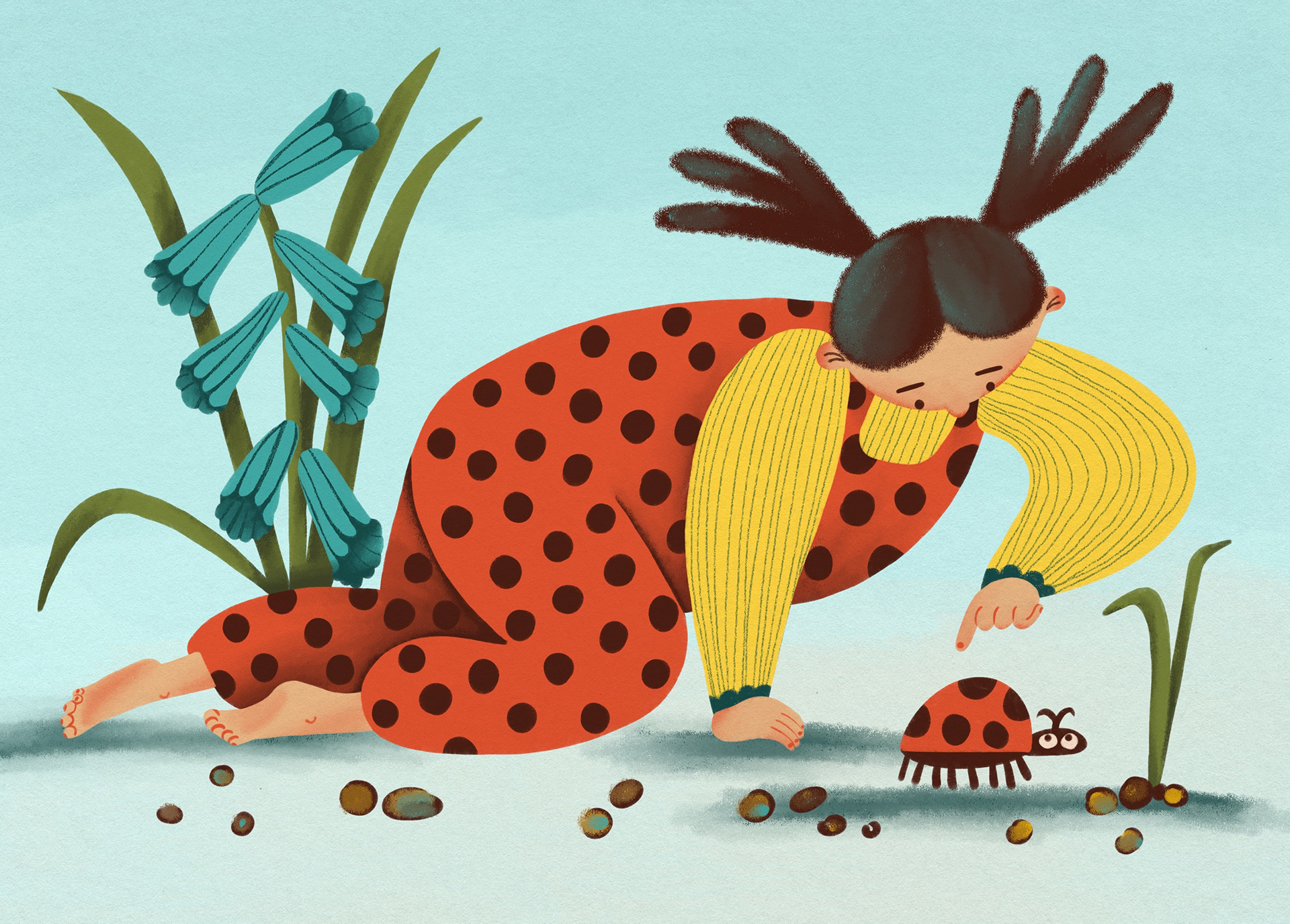 Project description: children and adult characters with ladybugs. It was inspired by many ladybugs had occupied all trees in my district in the spring of 2023. I spend much time watching them on playground with my kids.